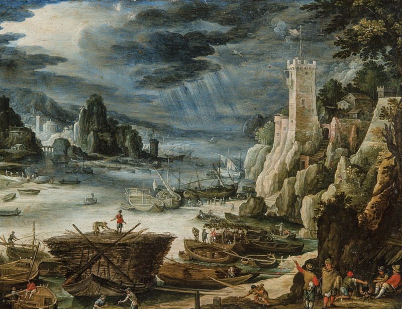 | Paysage rocheux avec port de mer et nombreuses figurines et embarcations | |