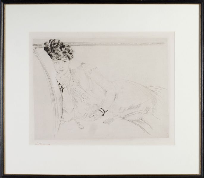RECLINING WOMAN WEARING A LONG STRING OF PEARLS