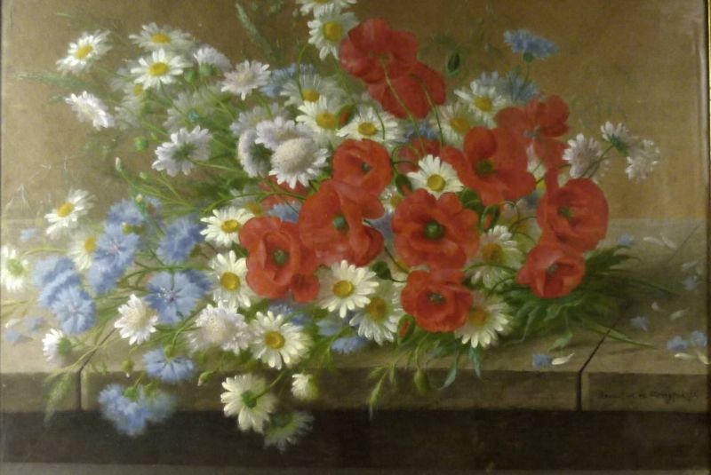 | Still life of poppies, cornflowers and daisies on a ledge | |