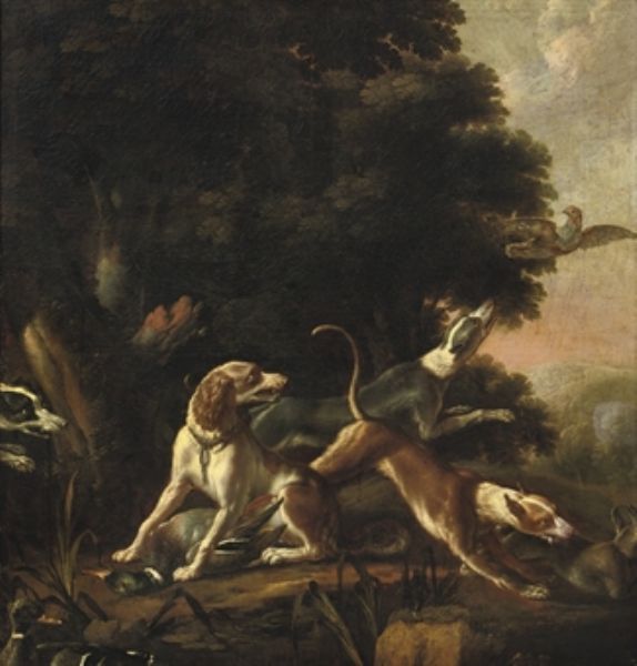 Hounds chasing game in a wooded landscape