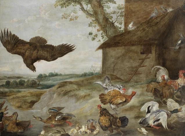 Hens and cockerels before a hen-house with a bird of prey swooping