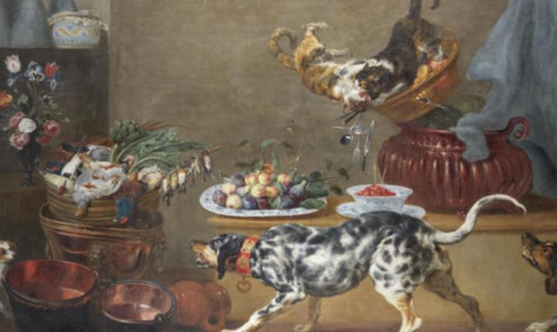 | Various flowers in vases, figs and strawberries in Kraak porcelain bowls, with copperware, dead game, two cats fighting and thre | |
