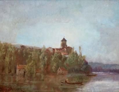 PAYSAGE DE RIVIÈRE AVEC BARQUE PRÈS DE L'ÉGLISE