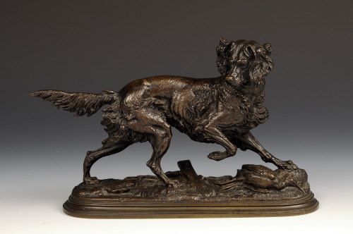 a spaniel at work, standing paw raised, and alert, with snipe at his feet