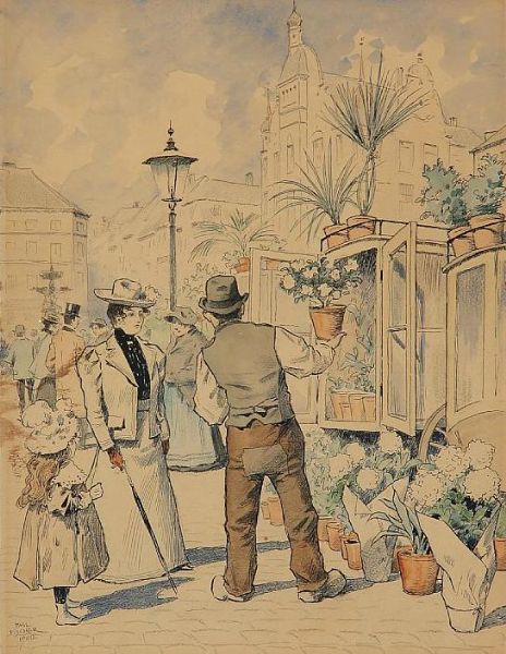 | A flower seller with a mother and daughter on Højbro Square in Copenhagen. | |