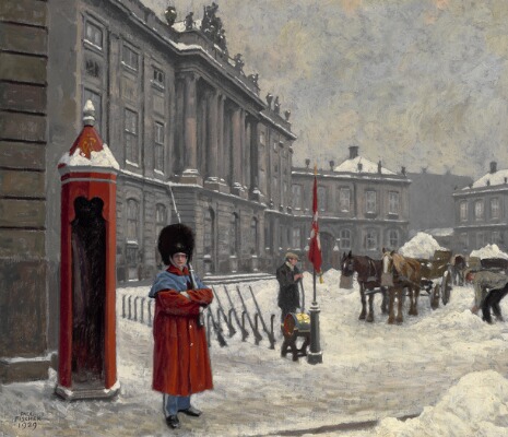 | A royal guard keeps watch at Amalienborg Palace in wintertime | |