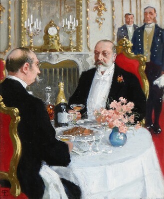 King Georg of Greece and King Edward VII of England toasting in champagne