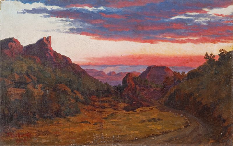 Sonnenuntergang über südlicher Berglandschaft mit einsamer Hütte