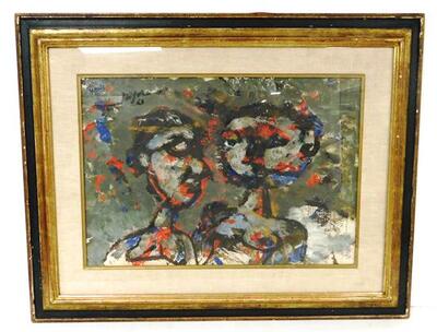 depicts two abstracted figures against grey, blue, and red background, incorporates text and printed materials in LR quadrant, signed and dated UL corner, framed and matted behind glass, gallery label verso, expected light wear, scattered losses to f | |