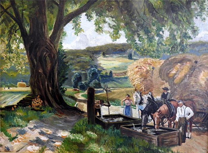Personen und Pferde mit einem Heuwagen an der Tränke