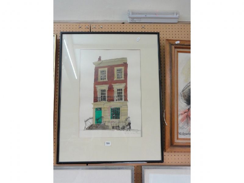 A Georgian house with woman and pushchair in front of the railings
