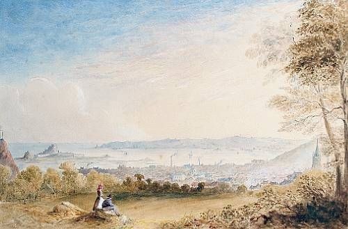 | Figures on a hill, with a view across St Helier, Jersey, beyond | |