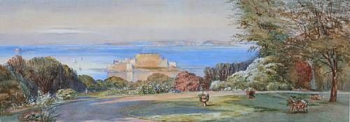 | A Guernsey coastal landscape, a view to the north with St.John's Church in the foreground and Vale Castle in the distance, toget | |