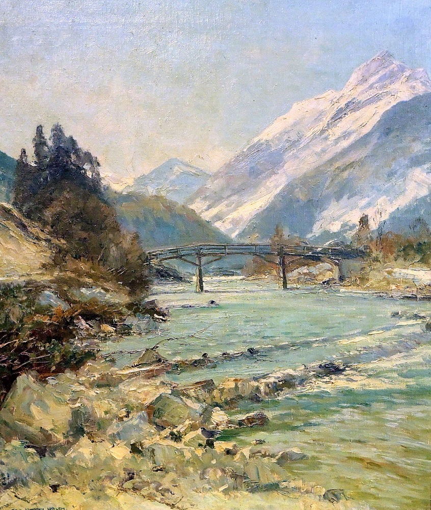 Bachlauf mit schneebedecktem Gebirge im Hintergrund