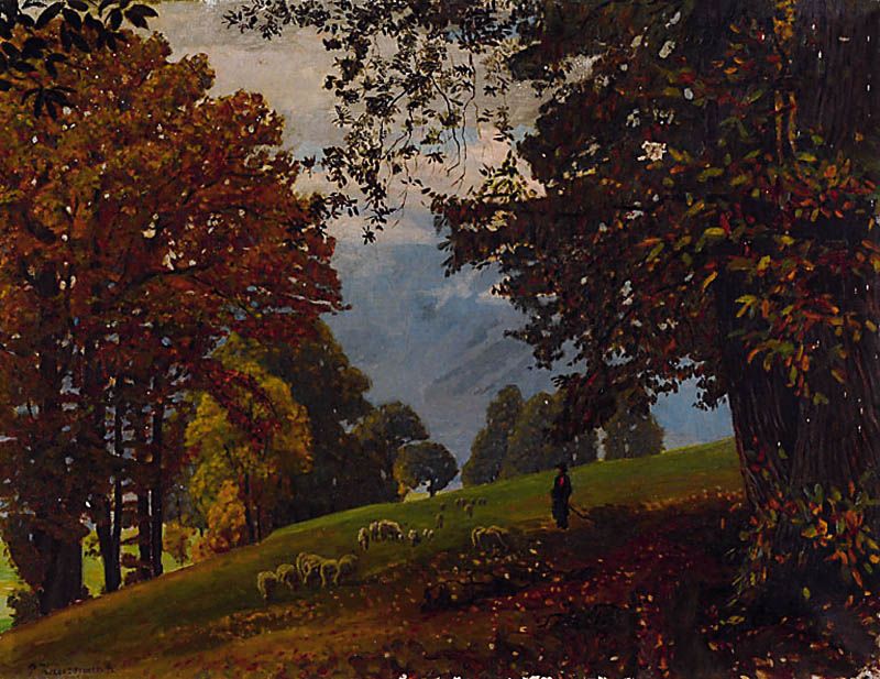 | Kastanien in Südtirol, bewaldete Hügellandschaft mit Schäfer und Herde, Weide tiefgestaffelt, lockerer lebendiger Farbauftrag be | |