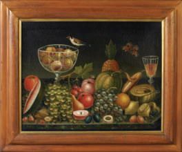 AMERICAN PRIMITIVE STILL-LIFE WITH FRUIT, BIRD AND BUTTERFLY ON A MARBLE TOP.