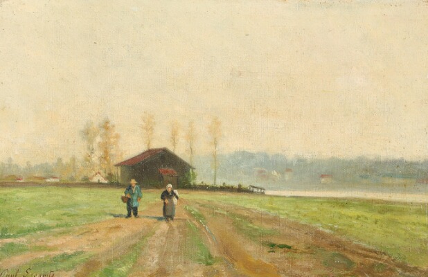 Landscape by a river with persons in the field