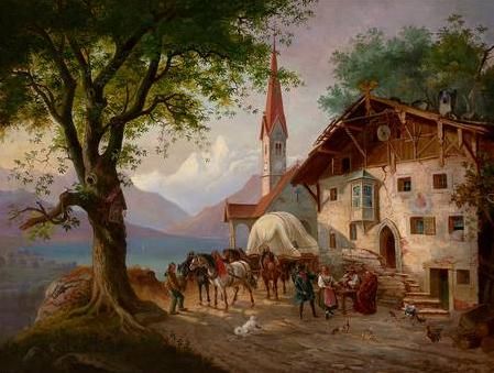 Figurenstaffage mit rastenden Reisenden vor malerischem Gasthaus am Seeufer