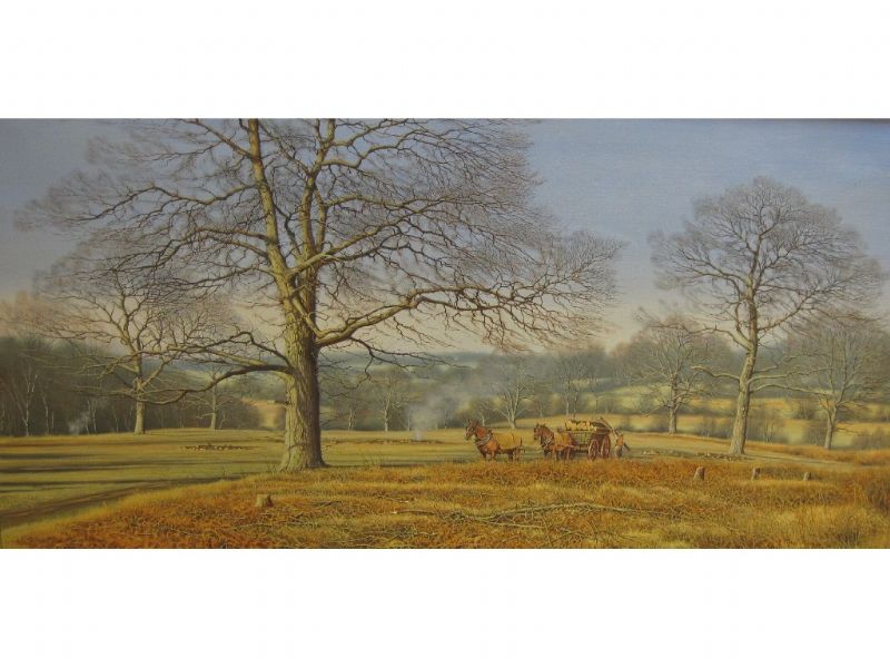 | An extensive parkland Landscape wuith woodman loading logs into a horse drawn Wagon | |