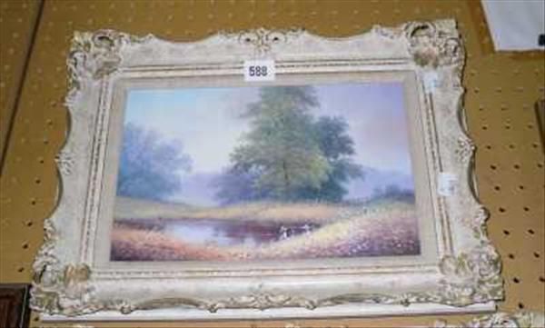| Figures reposing before a pond in summer Wild flower meadow and sheep before a lake | |