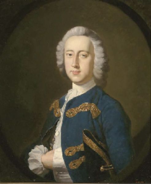 | Portrait of a gentleman, half-length, in a blue coat holding a black bicorn, in a feigned oval | |