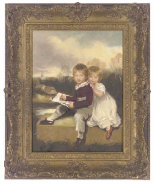 | Portrait of a young boy and girl, small full-length, the boy holding a pencil and paper, both beside a river, a spire beyond | |