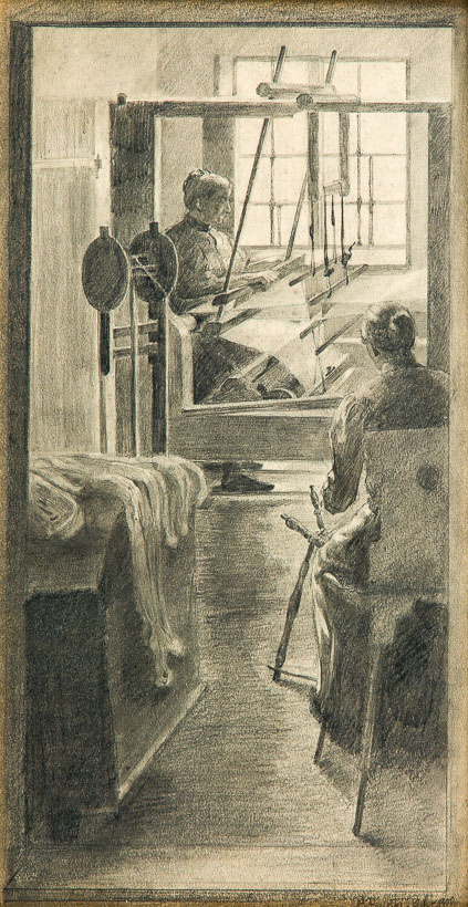 Heimarbeit. Ältere Frau am Webstuhl und eine Zweite an der Haspel