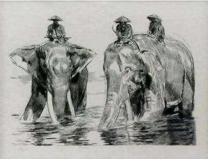 Eléphants et cornacs au bain