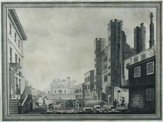 | A View of St James's Gate, London, from Cleveland Row, with a Sedan Chair passing by and a Cart being unloaded | |
