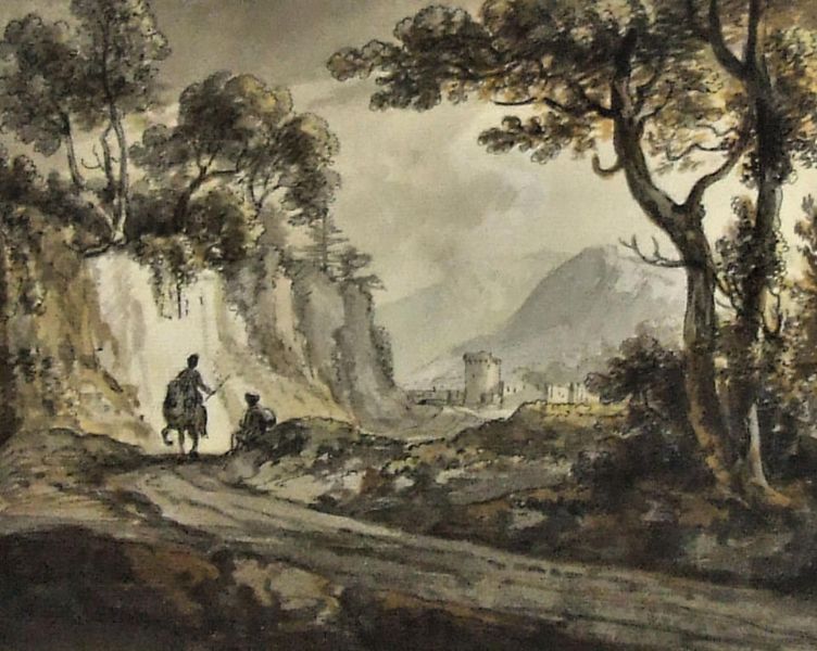 Mountain pathway with figures on a horse to foreground and a castle to background