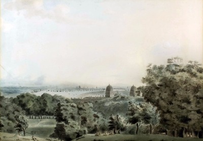 | A view across Greenwich Deer Park towards sailing vessels anchored in the Thames | |