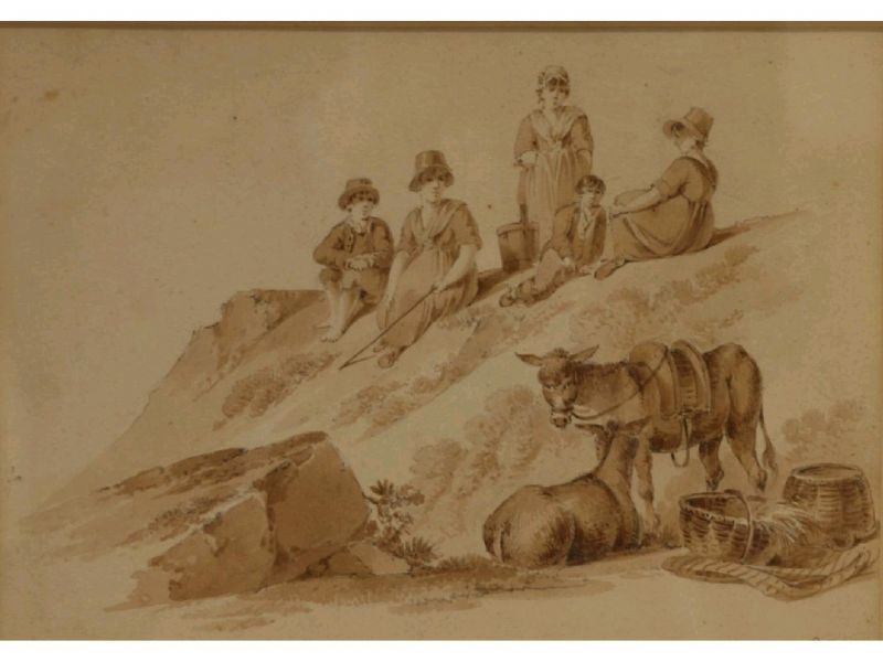 | Group of five figures resting on top of a bank, two donkeys with pannier below | |