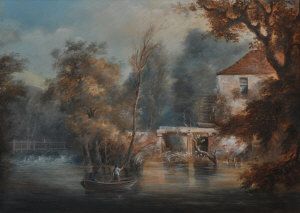 Fishermen in a boat before a watermill, and figures at the same watermill