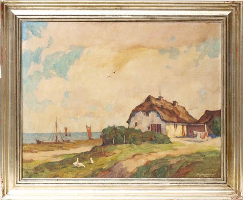 Fischerhaus auf einer Anhöhe über einer Meeresbucht