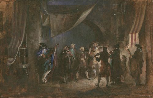 Nächtliche Szenerie mit Musikanten in einer südlichen Altstadtgasse