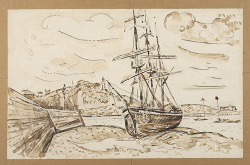 Brush and brown ink and black crayon on paper mounted on cardstock