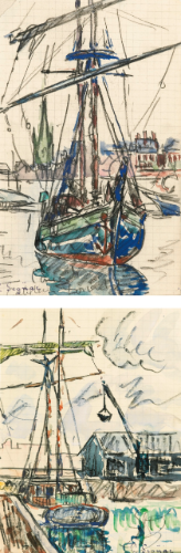 | DEUX DESSINS : (I) LORIENT, CABOTEUR À L'ANCRE (PAGE DE CARNET) (II) LA GRUE, CABOTEUR À QUAI DANS UN PORT BRETON (PAGE DE CARNE | |