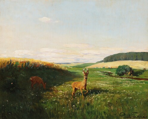 | “Rehe in der Abendsonne”. Evening light on a flowering field with roe deer | |