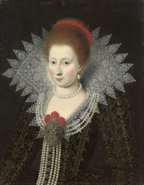 | Portrait of a lady, possibly Anne of Denmark (1574-1619), half-length, in a black embroidered and bejewelled dress with lace ruf | |