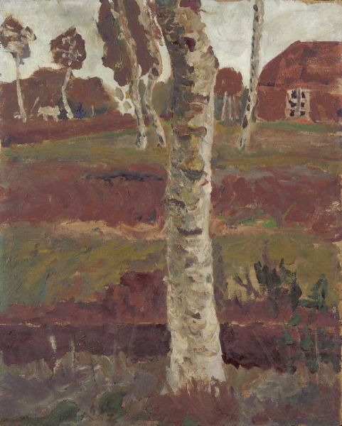 „BIRKENSTAMM AM MOORGRABEN VOR LANDSCHAFT MIT HAUS“. Um 1900