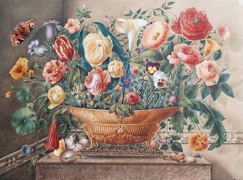 An arrangement of flowers and shells