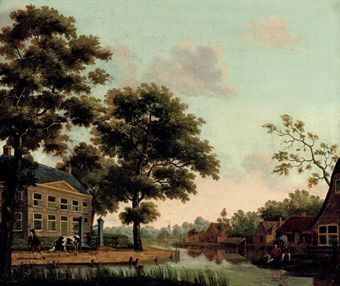 | A town along a river with figures conversing and a man dragging along a cow on a path | |