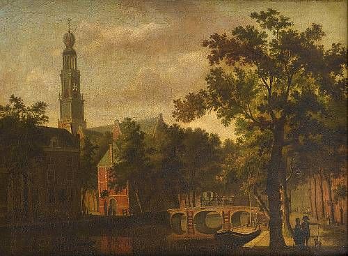 | The Westerkerk, Amsterdam, with figures on a canal path with a horsedrawn carriage crossing a bridge beyond | |