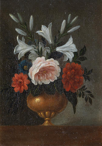 Lilies, peonies, a rose and other flowers in a gilt vase on a table-top
