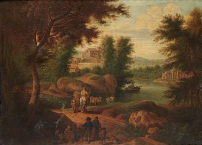 | Promeneurs et paysans sur un chemin le long d'une rivière | |