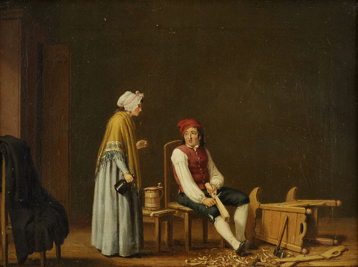 | Fruentimmer med flaska och man täljande trästycke till vagga | |