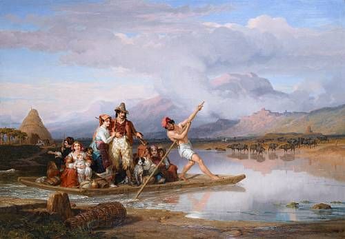 | A ferry on the Ninfa, Sermoneta in the distance - a scene in the Pontine marshes, near Rome | |