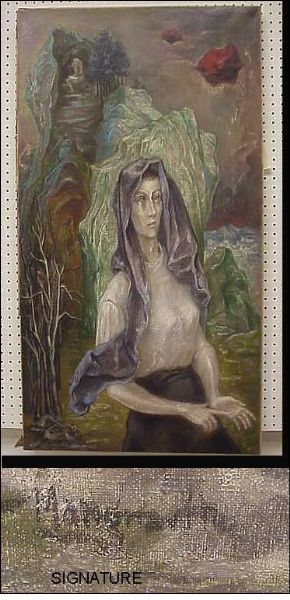 | woman with a blue veil in a rocky landscape with a second figure in the distance | |