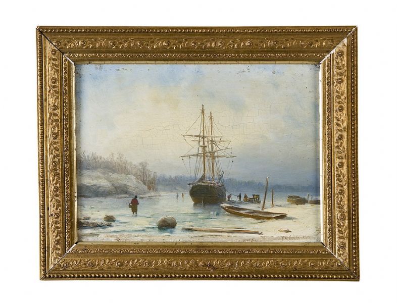 Vinterlandskap med ankrat segelfartyg och figurer.