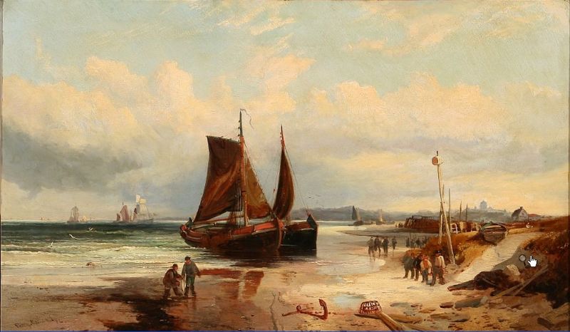 Coastal scene with ships and fishermen on the beach.